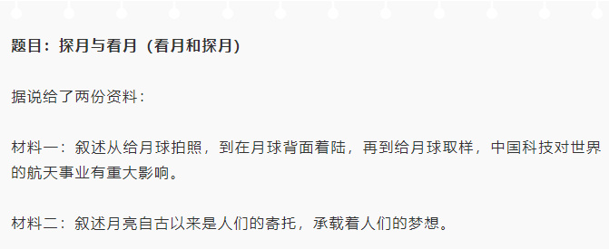 刚刚,厦门2024年中考首门科目语文考试结束。据记者从考生处了解到,今年福建中考作文题给出两份材料,涉及内容主题为“探月与看月”(或为“看月与探月”)。