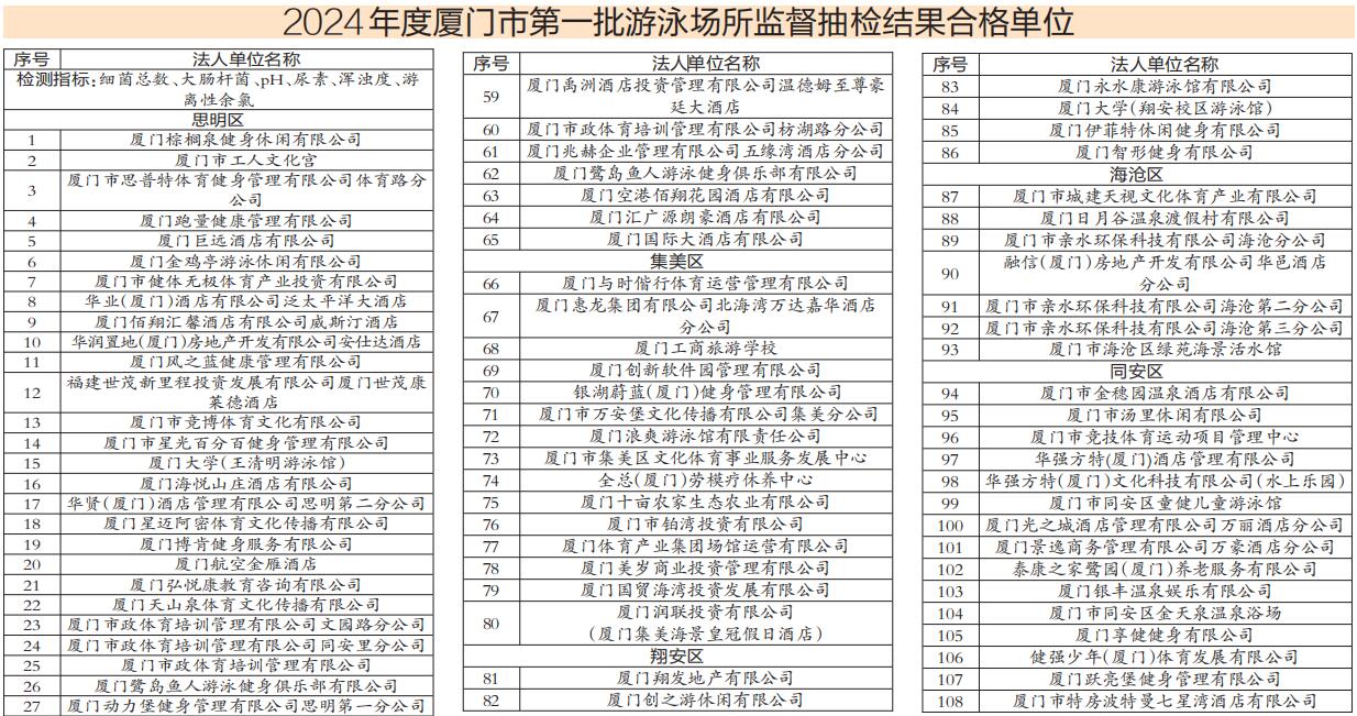 厦门网讯(厦门日报记者 刘蓉 通讯员 陈微微)昨日,厦门市卫健委公布首轮泳池检测结果:合格108家,合格率为88.52%;不合格14家,不合格率为11.48%,不合格指标主要为大肠菌群。13家不合格单位经监督整改后,水质抽检结果均合格,1家不合格单位游泳场所已注销。 根据《厦门市卫生健康委员会关于做好2024年国家随机监督抽查工作的通知》要求,今年5月开始,全市各级卫生监督机构分批次对各辖区游泳场所开展夏季游泳池卫生情况监督检查和水质抽检。本轮(第一批)抽检122家游泳场所,检测指标为游离性余氯、浑浊度、尿素、pH值、菌落总数、大肠菌群六项指标。 责任编辑: 李奕佳,赖旭华 |